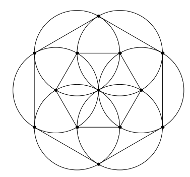 Six circles are centered at the vertices of a regular hexagon, as shown below. Thirteen intersection points result, one at the center and six at the vertices of the hexagon. The remaining six points determine another hexagon with an area equalling how many times the area of the original hexagon?